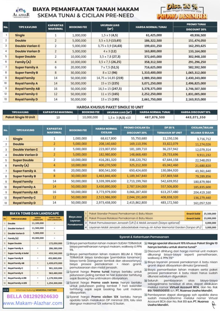 - Harga tanah kuburan al azhar spesial diskon 10% khusus untuk paket single 10 kavling, hanya berlaku untuk metode pembayaran cash.